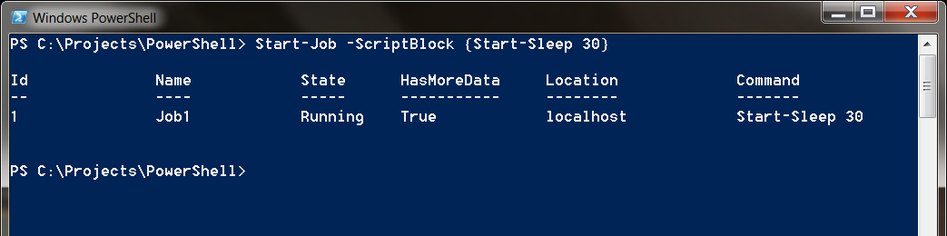 As you can see, Start-Job starts a background job (surprise, surprise!) and shows us some info of the newly created job.